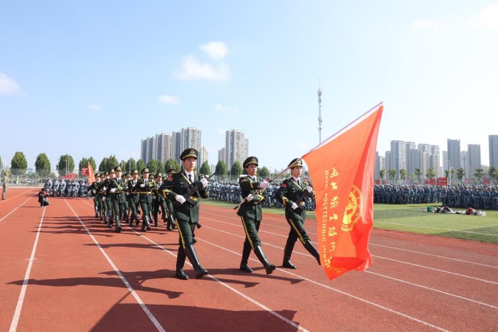 活动以雄壮的《中华人民共和国国歌》开篇,五星红旗冉冉升起,全体人员肃立行注目礼。随后军训成果汇报展开,70个新生方队依指令依次入场,身着迷彩服的新生迈着铿锵步伐、喊着洪亮口号,动作整齐划一,尽显军训成效与青春朝气。分列式后,特色表演方队登场:军体拳方队出拳如风、踢腿如雷;匕首操方队身形灵动,劈刺精准;刺杀操方队气势如虹,持枪突刺连贯有力,精彩表现赢得全场掌声。