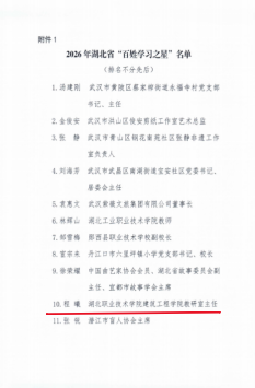 (本网讯 王菲)近日,湖北省社区教育指导中心正式公布2026年湖北省“百姓学习之星”评审结果,我校建筑工程学院程曦老师凭借在职教领域的深耕细作与终身学习的示范表率,从众多候选人中脱颖而出,成功获此殊荣。