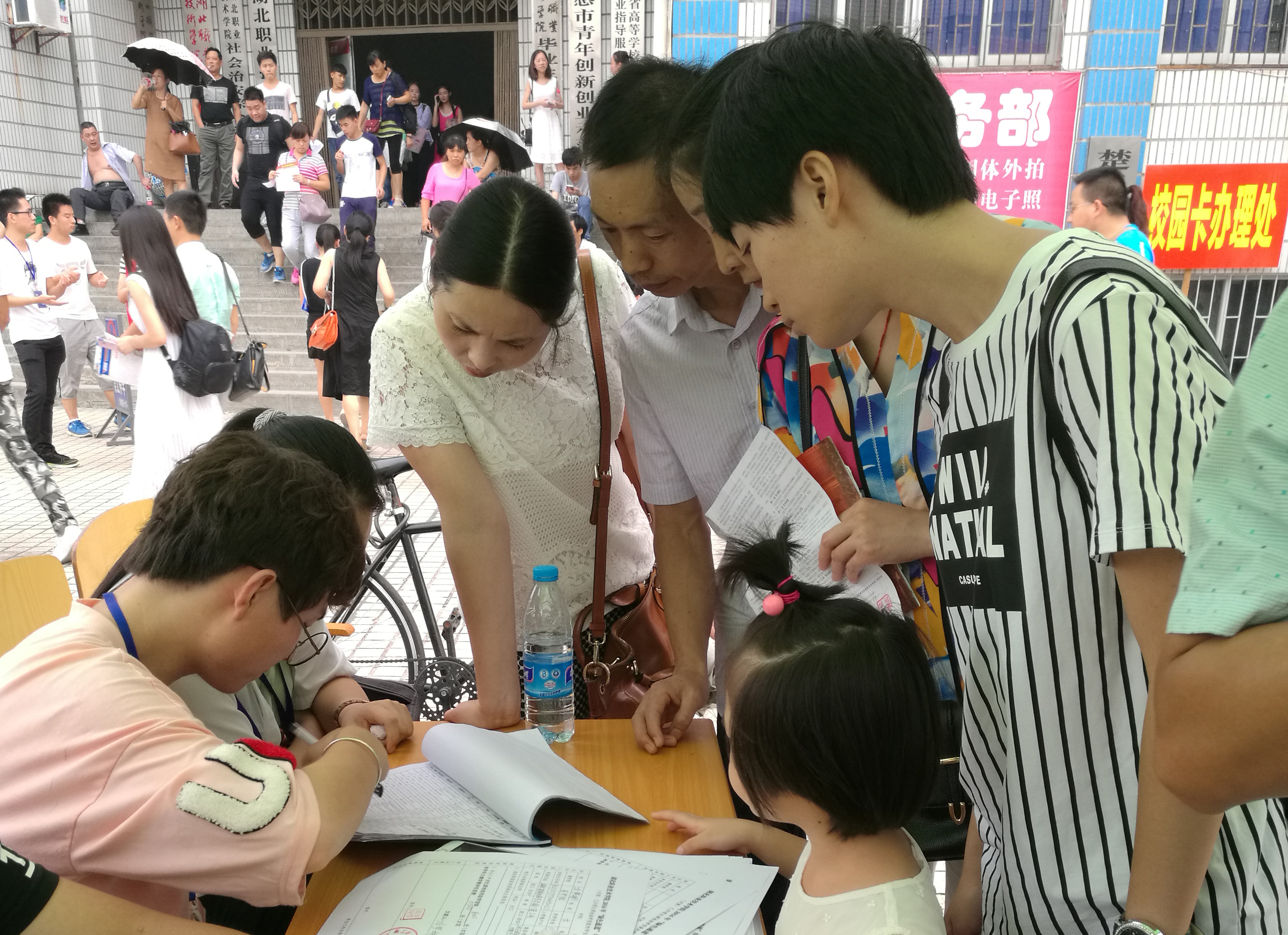 “同学,你是哪个教学院的?需要帮忙吗?”学生迎新志愿者顶着炎炎烈日,忙碌的穿梭在校园的各个角落,他们忙着为新同学缴费、办饭卡,他们忙着帮新同学拖行李箱、拿生活用品,他们忙着为新生指路……太阳晒黑了皮肤,汗水浸湿了衣服,他们没有半句怨言,用高涨的热情抒写着青春的风貌。迎新期间,学工处制定了周密的迎新方案,党政办公室、纪委做好了综合协调和纪律保障工作,党委宣传部为迎新营造了热烈的氛围,教务、招生部门认真做好学籍、专业的登记与管理工作,后勤处、后勤服务中心尽心竭力做好后勤保障工作,财务、保卫等部门积极做好经费收缴和安全保卫工作,……各职能部门及院部负责人坐镇迎新一线,及时为新生及家长解答各种疑问,全体迎新工作者个个精神饱满,热情、细致、周到地服务,确保了迎新工作高效、有序。