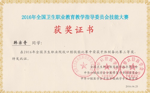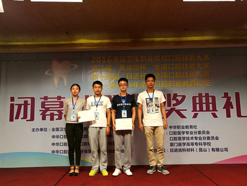 6月25日至26日,由全国卫生职业教育教学指导委员会、中华口腔医学会共同主办的2016年全国卫生职业院校口腔技能大赛在厦门医学院隆重举行。来自全国70多所本专科院校300多名选手参加了比赛。我校选派了医学院4名选手参加了牙体制备、雕牙与排牙二个项目比赛,经过两天激烈的角逐,韩宗奇、薛亢两位同学均获得了牙体制备组三等奖的好成绩。