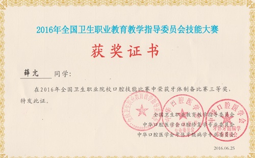 全国卫生职业院校口腔技能大赛是目前本专业技能大赛的最高级别赛项,不分本科、专科,本专科学生同台竞技。本次大赛共设牙体制备、雕牙与排牙、CAD修复体设计三个项目,分设综合奖和单项奖。通过本次大赛,检验了我校口腔医学专业的教学效果,对专业建设与发展起到了积极的促进作用。