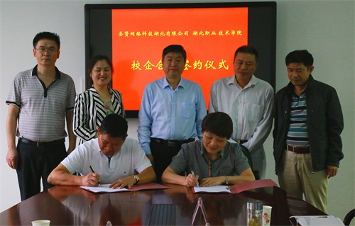 签字仪式上,朱虹致欢迎辞并介绍了学校基本情况。她指出,落实国家科教兴国战略,促进科技创新,加快企业经济发展和社会进步,高校在技术、人力资源方面具有天然优势,通过校企合作将科研成果转化为生产力,形成学校和企业实现“校企合作,产学双赢”的局面,是我们实施创新发展三年行动计划的有力举措。张洪涛介绍了圣贤网络利用大数据、移动互联、云计算等新技术手段,致力于互联网+和智慧物联技术、智能硬件、移动电商及O2O解决方案的研发落地,推动智慧孝感的建设。他希望能从湖北职院吸收智力投资,共同为孝感智慧城市建设服务。签字仪式后,双方技术人员还就产品研发技术细节、学生订单培养进行了深入探讨。