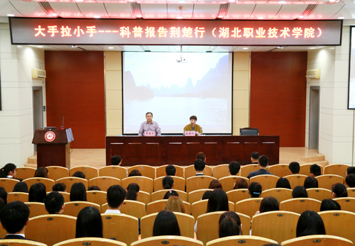 湖北省科学技术协会青少年中心主任李志芳,湖北职业技术学院校长、孝感市科技协会副主席朱虹,孝感市科学技术协会副主席丁金元等出席了相关活动。学校相关处室、教学院负责人及师生代表近300人济济一堂,认真聆听了报告会。报告会由学校校长朱虹主持。