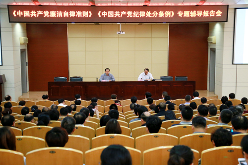 4月13日下午,孝感市委常委、市纪委书记孙兵到校作学习贯彻《中国共产党廉洁自律准则》、《中国共产党纪律处分条例》专题辅导报告。学校全体校领导、纪委委员、中层干部、基层党组织纪检委员、党员教师和辅导员代表等参加了报告会。会议由学校党委书记蔡诗红主持。
