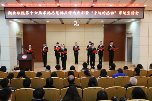 12月16日下午,学校第十六届孝德感恩标兵(之星)表彰暨“身边的感动”事迹宣讲会在学校图书馆学术报告厅隆重举行。学校党委书记蔡诗红、副校长梅重等出席了会议。学校先进典型模范代表左德汉,学校党委宣传部、学工处团委等部门负责人、各二级学院学管副院长、辅导员代表、本届孝德感恩评先选活动先进个人及先进集体的代表等参加了会议。