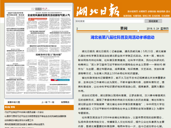 湖北日报讯 5月23日,湖北省第八届社会科学普及周活动在湖北职业技术学院正式启动。未来一周,省社科联会同各市州社科联、社科普及教育基地、社科学术团体、民办社科研究机构等将以“深入学习宣传习近平新时代中国特色社会主义思想——新时代·新作为”为主题,通过专题讲座、成果展演、知识竞赛、文艺活动、发放科普读物等方式,为全省人民送上100余场社科知识盛宴。