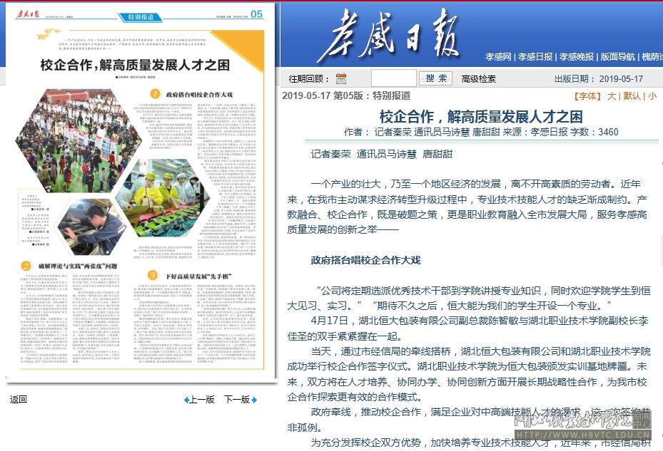 今年3月,市经信局在汉川市组织召开相关企业与孝感市高校合作座谈会。会上,恒大包装、双桥食品、康欣新材料等11家企业提出了企业用工诉求,并与湖北职业技术学院、孝感生物工程学校负责人进行面对面的交流。此次湖北职业技术学院与恒大包装举行的校企合作签字仪式,正是这次座谈会的成果之一。