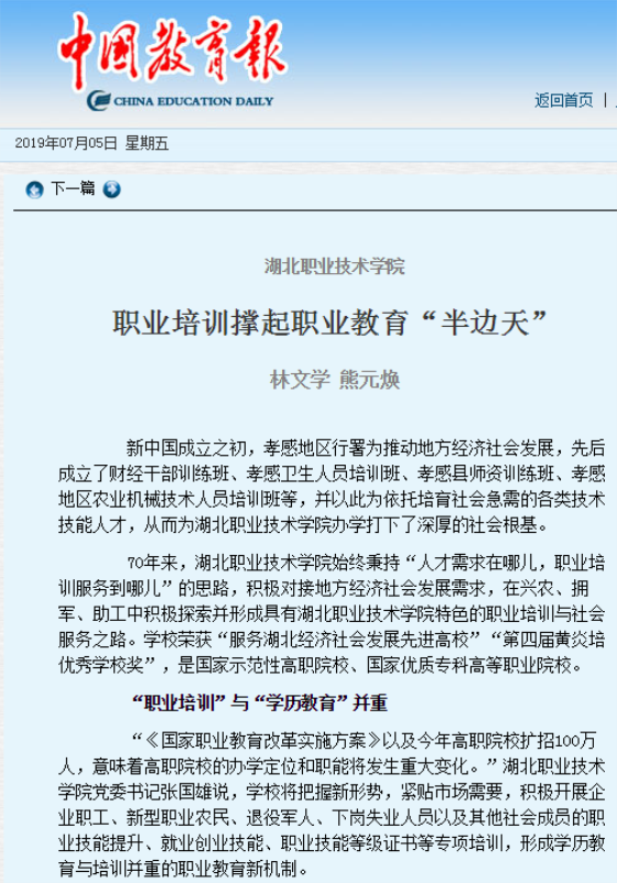 展望新时代,湖北职业技术学院将不断完善职业培训和多元社会服务体系,发挥高职院校人才资源和专业技术优势,为地方经济社会发展培养更多高素质技能型人才,为建成“中国特色高水平高等职业学校”努力奋斗! (林文学 熊元焕)