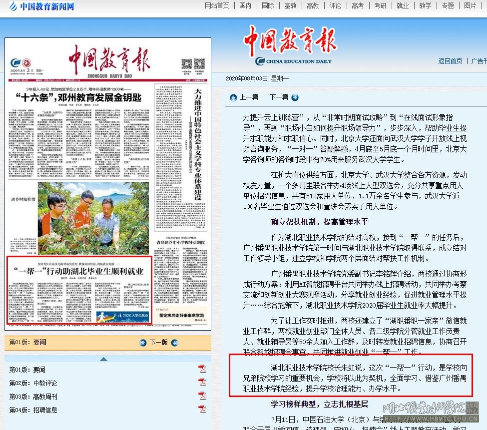 广州番禺职业技术学院党委副书记李铭辉介绍,两校通过协商形成行动方案:利用AI智能招聘平台共同举办线上招聘活动,共同举办考察交流和创新创业大赛观摩活动,分享就业创业经验,促进就业管理水平提升……综合施策下,湖北职业技术学院2020届毕业生就业率大幅提升。