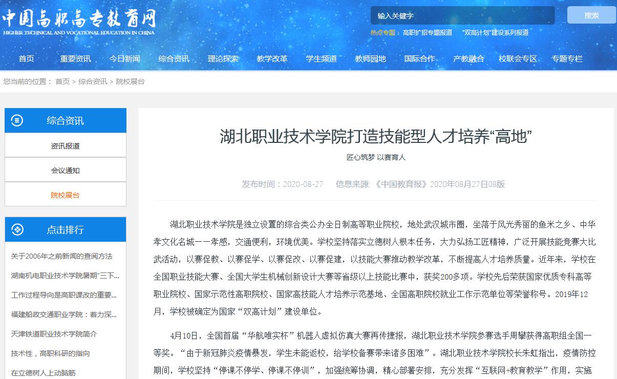 湖北职业技术学院是独立设置的综合类公办全日制高等职业院校,地处武汉城市圈,坐落于风光秀丽的鱼米之乡、中华孝文化名城——孝感,交通便利,环境优美。学校坚持落实立德树人根本任务,大力弘扬工匠精神,广泛开展技能竞赛大比武活动,以赛促教、以赛促学、以赛促改、以赛促建,以技能大赛推动教学改革,不断提高人才培养质量。近年来,学校在全国职业技能大赛、全国大学生机械创新设计大赛等省级以上技能比赛中,获奖200多项。学校先后荣获国家优质专科高等职业院校、国家示范性高职院校、国家高技能人才培养示范基地、全国高职院校就业工作示范单位等荣誉称号。2019年12月,学校被确定为国家“双高计划”建设单位。