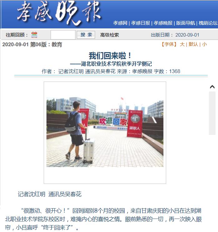 “很激动、很开心!”回到阔别8个月的校园,来自甘肃庆阳的小吕在达到湖北职业技术学院东校区时,难掩内心的喜悦之情。眼前熟悉的一切,再一次映入眼帘,小吕直呼“终于回来了”。