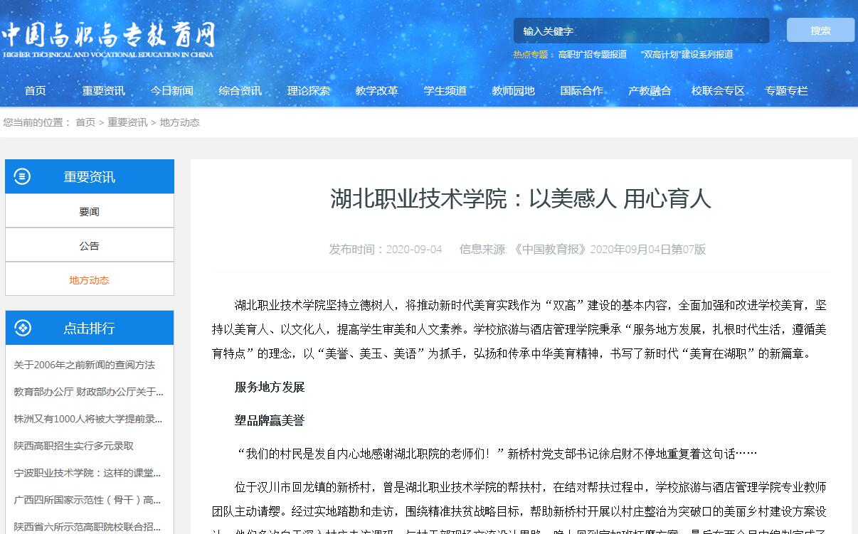 湖北职业技术学院坚持立德树人,将推动新时代美育实践作为“双高”建设的基本内容,全面加强和改进学校美育,坚持以美育人、以文化人,提高学生审美和人文素养。学校旅游与酒店管理学院秉承“服务地方发展,扎根时代生活,遵循美育特点”的理念,以“美誉、美玉、美语”为抓手,弘扬和传承中华美育精神,书写了新时代“美育在湖职”的新篇章。