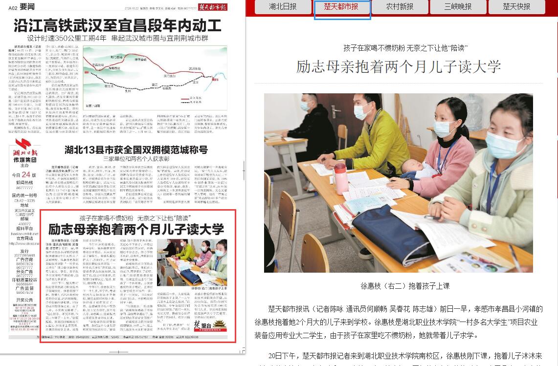 楚天都市报讯(记者陈咏 通讯员何顺畅 吴春花 陈志雄)前日一早,孝感市孝昌县小河镇的徐惠枝抱着她2个月大的儿子来到学校。徐惠枝是湖北职业技术学院“一村多名大学生”项目农业装备应用专业大二学生,由于孩子在家里吃不惯奶粉,她就带着儿子求学。