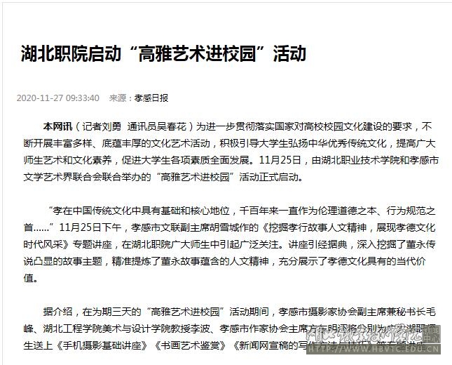 本网讯(记者刘勇 通讯员吴春花)为进一步贯彻落实国家对高校校园文化建设的要求,不断开展丰富多样、底蕴丰厚的文化艺术活动,积极引导大学生弘扬中华优秀传统文化,提高广大师生艺术和文化素养,促进大学生各项素质全面发展。11月25日,由湖北职业技术学院和孝感市文学艺术界联合会联合举办的“高雅艺术进校园”活动正式启动。