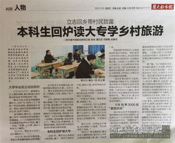 “我老家靠近阳平工业园,发展旅游可能性不大,但是我在湖北职院乡村旅游专业所学到的理论知识对于实施乡村振兴战略、开展美丽乡村建设、推动家乡的产业发展都具有很强的指导作用。”熊文文说,通过学习,他对以后回村的发展,有了初步的想法。
