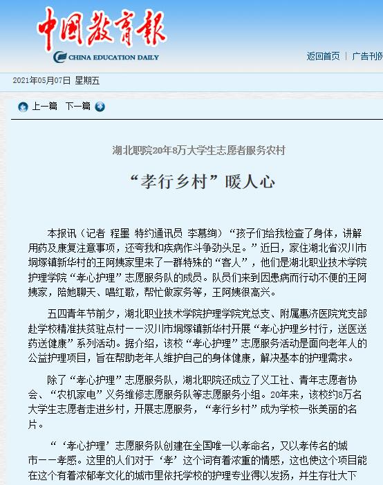 “‘孝心护理’志愿服务队创建在全国唯一以孝命名,又以孝传名的城市——孝感。这里的人们对于‘孝’这个词有着浓重的情感,这也使这个项目能在这个有着浓郁孝文化的城市里依托学校的护理专业得以发扬,并生存壮大下去。”湖北职业技术学院校长朱虹介绍,“学校多年以‘孝’文化为核心,以孝育人,今后将继续发挥专业、资源等优势,深入乡村,助力乡村振兴战略。”