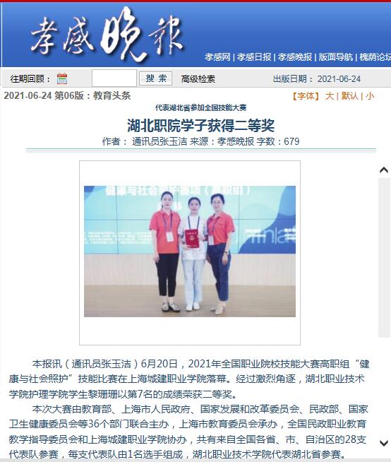 6月20日,2021年全国职业院校技能大赛高职组“健康与社会照护”技能比赛在上海城建职业学院落幕。经过激烈角逐,湖北职业技术学院护理学院学生黎珊珊以第7名的成绩荣获二等奖。
