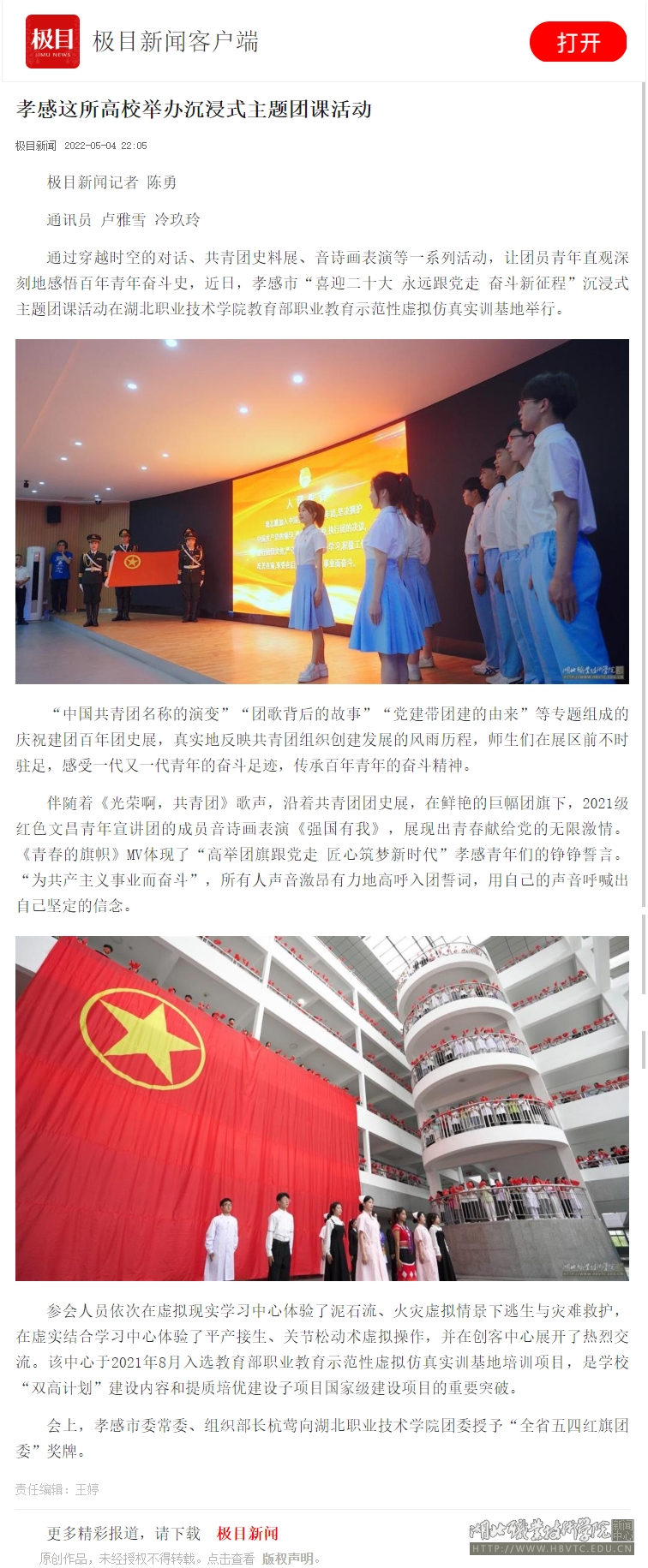 通过穿越时空的对话、共青团史料展、音诗画表演等一系列活动,让团员青年直观深刻地感悟百年青年奋斗史,近日,孝感市“喜迎二十大 永远跟党走 奋斗新征程”沉浸式主题团课活动在湖北职业技术学院教育部职业教育示范性虚拟仿真实训基地举行。