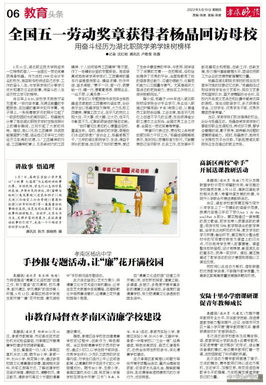 5月11日,湖北职业技术学院迎来一位特殊的客人——全国五一劳动奖章获得者杨晶。作为该校1999级会计专业的校友,她回到母校讲述自己求学、工作的奋斗人生,与学弟学妹们分享学习成长和建功立业的故事,用奋斗的人生经历树立学习的榜样。