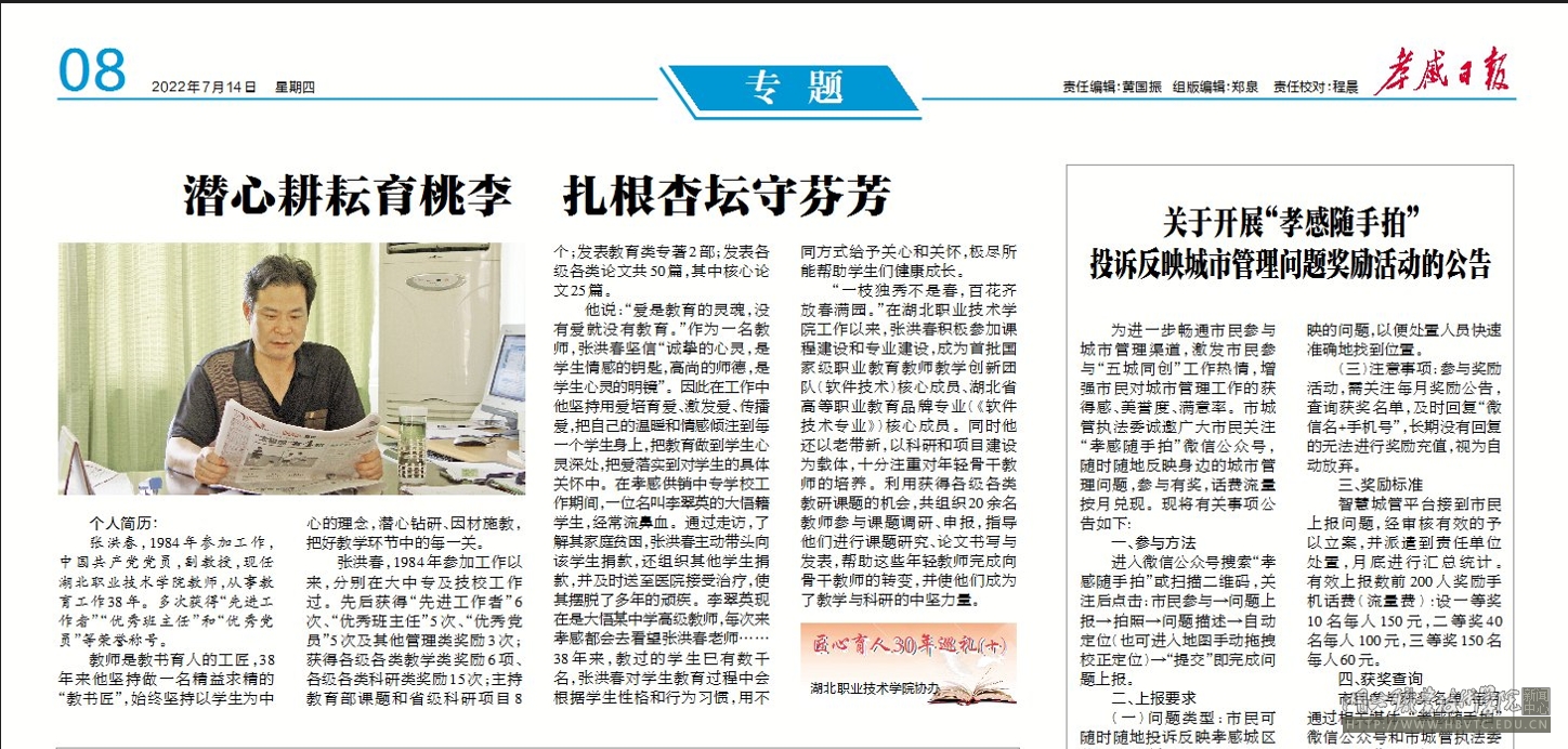 “一枝独秀不是春,百花齐放春满园”。在湖北职业技术学院工作以来,积极参加课程建设和专业建设,成为首批国家级职业教育教师教学创新团队(软件技术)核心成员、湖北省高等职业教育品牌专业(《软件技术专业》)核心成员。同时以老带新,以科研和项目建设为载体,十分注重对年轻骨干教师的培养。利用获得各级各类教研课题的机会,共组织20余名教师参与课题调研、申报,指导他们进行课题研究、论文书写与发表,帮助这些年轻教师完成向骨干教师的转变,并使他们成为了教学与科研的中坚力量。