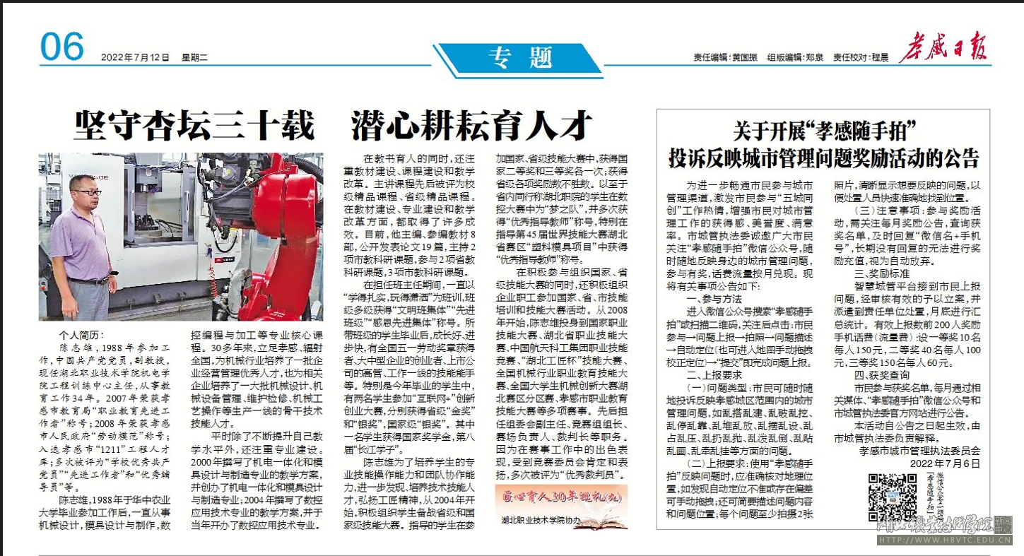 陈志雄,1988年于华中农业大学毕业参加工作后,一直从事机械设计,模具设计与制作,数控编程与加工等专业核心课程。30多年来,立足孝感、辐射全国,为机械行业培养了一批企业经营管理优秀人才,也为相关企业培养了一大批机械设计、机械设备管理、维护检修、机械工艺操作等生产一线的骨干技术技能人才。