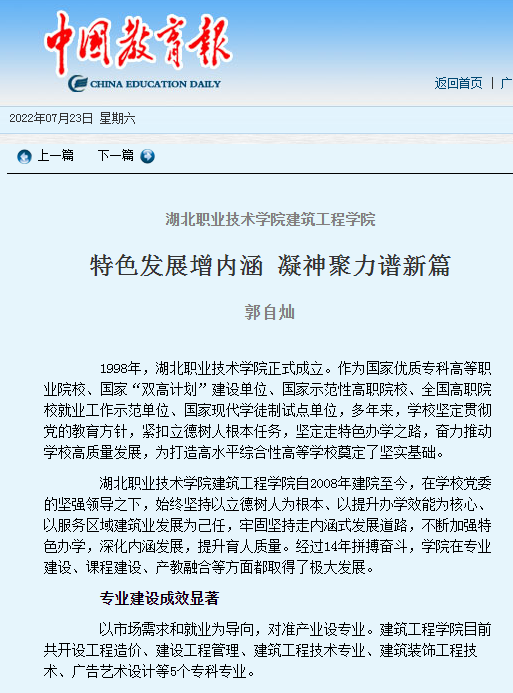 湖北职业技术学院建筑工程学院自2008年建院至今,在学校党委的坚强领导之下,始终坚持以立德树人为根本、以提升办学效能为核心、以服务区域建筑业发展为己任,牢固坚持走内涵式发展道路,不断加强特色办学,深化内涵发展,提升育人质量。经过14年拼搏奋斗,学院在专业建设、课程建设、产教融合等方面都取得了极大发展。