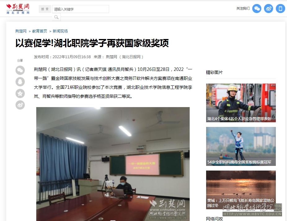 荆楚网(湖北日报网)讯(记者唐天琪 通讯员肖智兵)10月26日至28日,2022“一带一路”暨金砖国家技能发展与技术创新大赛之商务IT软件解决方案赛项在南通职业大学举行。全国71所职业院校参加了本次竞赛,湖北职业技术学院信息工程学院李岚、肖智兵等教师指导的参赛选手杨圣贤荣获二等奖。