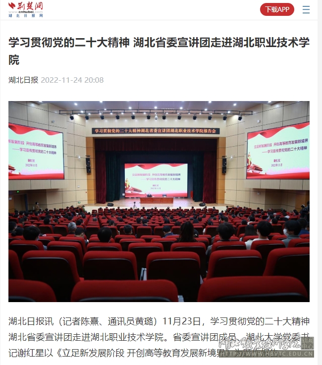 湖北日报讯(记者陈熹、通讯员黄璐)11月23日,学习贯彻党的二十大精神湖北省委宣讲团走进湖北职业技术学院。省委宣讲团成员、湖北大学党委书记谢红星以《立足新发展阶段 开创高等教育发展新境界》为题作报告。