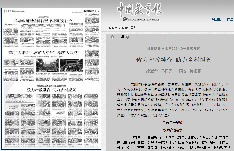高职院校要增强使命感、责任感、紧迫感,为稳就业、保民生、扩大中等收入群体、促进共同富裕作出积极贡献,办好人民满意的高等教育。湖北职业技术学院财经与旅游学院认真贯彻落实《国家职业教育改革实施方案》《职业教育提质培优行动计划(2020—2023年)》《关于推动现代职业教育高质量发展的意见》精神,“五主+五赋”致力产教融合,“五接+五共”助力乡村振兴,推动高等教育“长入”经济、“汇入”城乡、“融入”产业、“渗入”农业、“进入”生产。