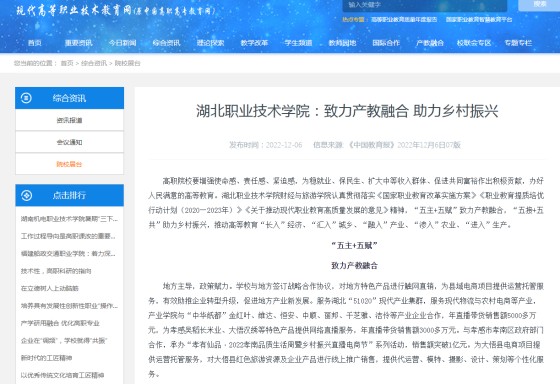 高职院校要增强使命感、责任感、紧迫感,为稳就业、保民生、扩大中等收入群体、促进共同富裕作出积极贡献,办好人民满意的高等教育。湖北职业技术学院财经与旅游学院认真贯彻落实《国家职业教育改革实施方案》《职业教育提质培优行动计划(2020—2023年)》《关于推动现代职业教育高质量发展的意见》精神,“五主+五赋”致力产教融合,“五接+五共”助力乡村振兴,推动高等教育“长入”经济、“汇入”城乡、“融入”产业、“渗入”农业、“进入”生产。