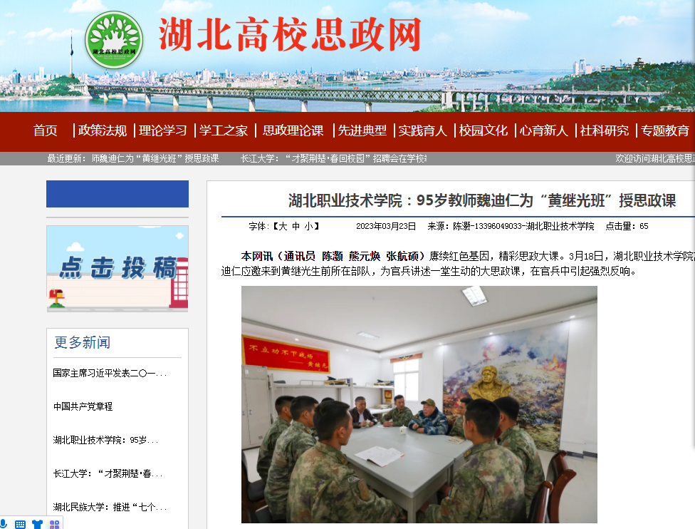 本网讯(通讯员 陈灏 熊元焕 张航硕)赓续红色基因,精彩思政大课。3月18日,湖北职业技术学院离休干部魏迪仁应邀来到黄继光生前所在部队,为官兵讲述一堂生动的大思政课,在官兵中引起强烈反响。