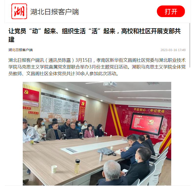 湖北日报客户端讯(通讯员陈露)3月15日,孝南区新华街文昌阁社区党委与湖北职业技术学院马克思主义学院直属党支部联合举办3月份主题党日活动。湖职马克思主义学院全体党员教师、文昌阁社区全体党员共计30余人参加此次活动。