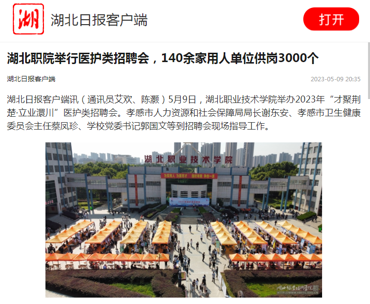 (通讯员艾欢、陈灏)5月9日,湖北职业技术学院举办2023年“才聚荆楚·立业澴川”医护类招聘会。孝感市人力资源和社会保障局局长谢东安、孝感市卫生健康委员会主任蔡凤珍、学校党委书记郭国文等到招聘会现场指导工作。