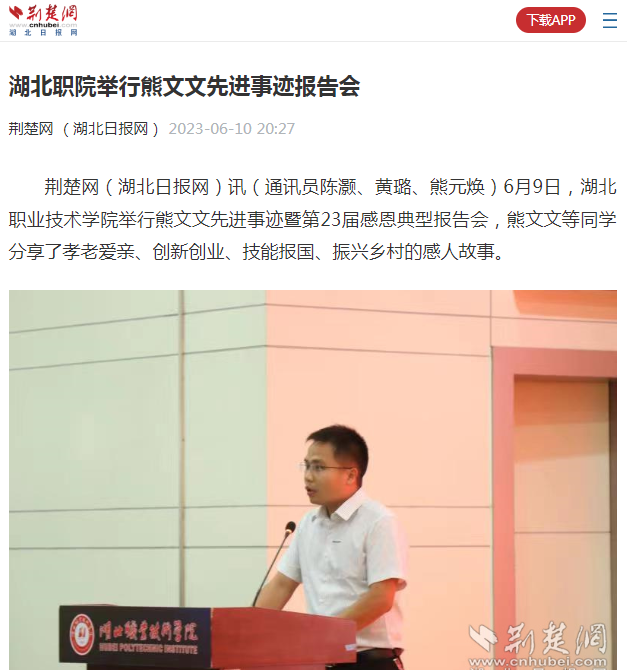 荆楚网(湖北日报网)讯 6月9日,湖北职业技术学院举行熊文文先进事迹暨第23届感恩典型报告会,熊文文等同学分享了孝老爱亲、创新创业、技能报国、振兴乡村的感人故事。