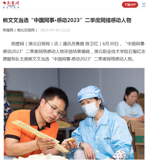 荆楚网(湖北日报网)(通讯员 黄璐 陈卫红 )6月30日,“中国网事·感动2023”二季度网络感动人物评选结果揭晓,湖北职业技术学院石榴红志愿服务队主席熊文文当选“中国网事·感动2023”二季度网络感动人物。