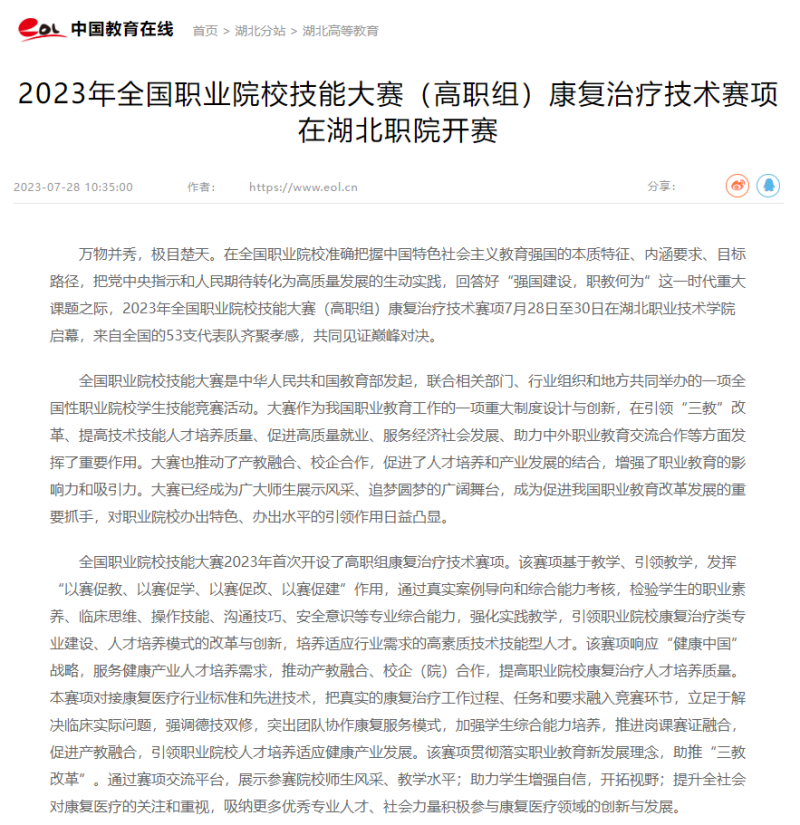 万物并秀,极目楚天。在全国职业院校准确把握中国特色社会主义教育强国的本质特征、内涵要求、目标路径,把党中央指示和人民期待转化为高质量发展的生动实践,回答好“强国建设,职教何为”这一时代重大课题之际,2023年全国职业院校技能大赛(高职组)康复治疗技术赛项7月28日至30日在湖北职业技术学院启幕,来自全国的53支代表队齐聚孝感,共同见证巅峰对决。