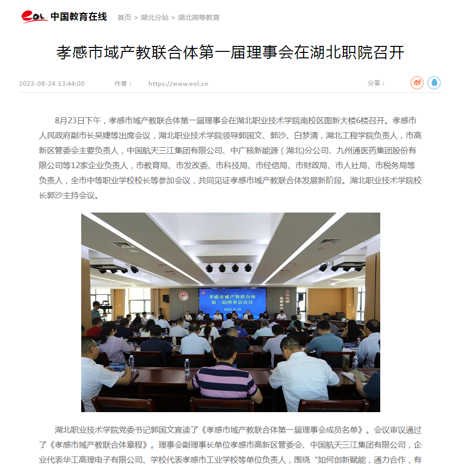 8月23日下午,孝感市域产教联合体第一届理事会在湖北职业技术学院南校区图新大楼6楼召开。孝感市人民政府副市长吴婕等出席会议,湖北职业技术学院领导郭国文、郭沙、白梦清,湖北工程学院负责人,市高新区管委会主要负责人,中国航天三江集团有限公司、中广核新能源(湖北)分公司、九州通医药集团股份有限公司等12家企业负责人,市教育局、市发改委、市科技局、市经信局、市财政局、市人社局、市税务局等负责人,全市中等职业学校校长等参加会议,共同见证孝感市域产教联合体发展新阶段。湖北职业技术学院校长郭沙主持会议。