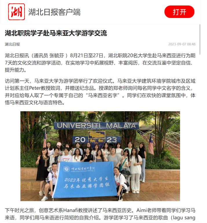 湖北日报讯(通讯员 张毓芬 )8月21日至27日,湖北职院20名大学生赴马来西亚进行为期7天的文化交流和游学活动,在实地学习中拓展视野、丰富阅历,在交流互鉴中坚定自信、提升能力。