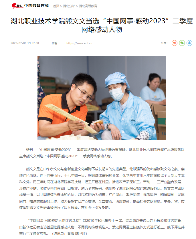 近日,“中国网事·感动2023”二季度网络感动人物评选结果揭晓,湖北职业技术学院石榴红志愿服务队主席熊文文当选“中国网事·感动2023”二季度网络感动人物。