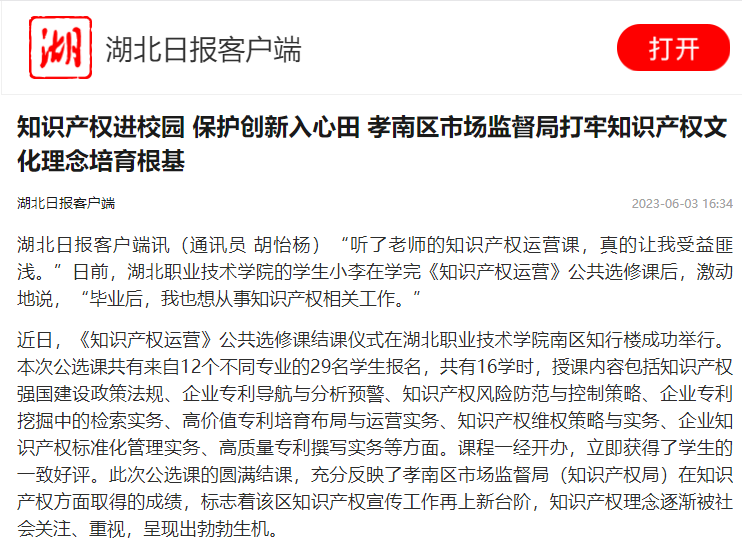 湖北日报客户端讯(通讯员 胡怡杨)“听了老师的知识产权运营课,真的让我受益匪浅。”日前,湖北职业技术学院的学生小李在学完《知识产权运营》公共选修课后,激动地说,“毕业后,我也想从事知识产权相关工作。”