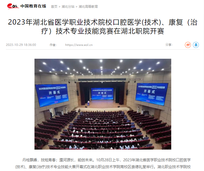 丹桂飘香,技炫青春;澴河源长,能创未来。10月28日上午,2023年湖北省医学职业技术院校口腔医学(技术)、康复(治疗)技术专业技能大赛开幕式在湖北职业技术学院南校区崇德礼堂举行。湖北职业技术学院校长郭沙,湖北省卫生健康委科技教育处调研员张有元,武汉大学医学职业技术学院院长、省医教室主任委员、竞赛仲裁长吴昌哲,大赛专家裁判、新闻媒体代表等出席开幕式,来自全省医学职业院校的47支代表队,相关企业、机构代表等参加开幕式。裁判代表任国锋、参赛选手代表杨泽浩宣誓。开幕式由湖北职业技术学院副校长胡昌杰主持。