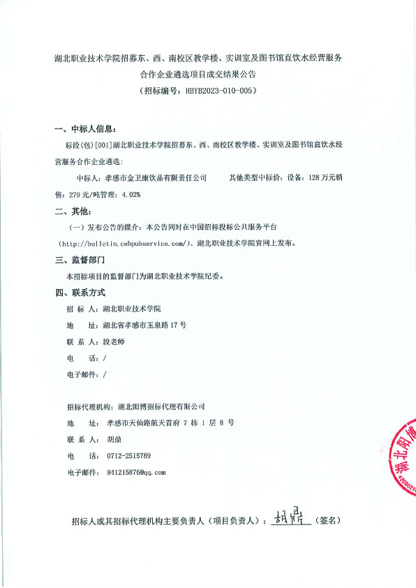 湖北职业技术学院招募东、西、南校区教学楼、实训室及图书馆直饮水经营服务合作企业遴选项目成交结果公告