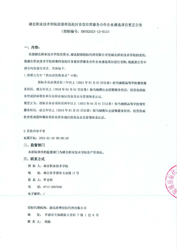 湖北职业技术学院招募师范校区食堂经营服务合作企业遴选项目更正公告