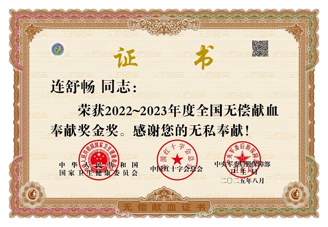 (本网讯 张天柱)近日,从国家卫生健康委员会传来喜讯,我校建筑工程学院2024届校友、2024届优秀毕业生、中共党员连舒畅因在无偿献血事业中的突出贡献,荣获“全国无偿献血奉献奖金奖”。
