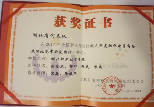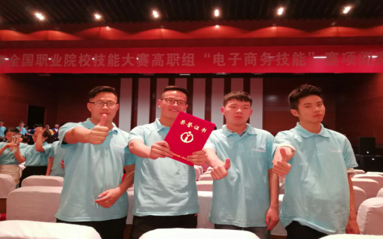 5月12日,2017年全国职业院校技能大赛高职组电子商务技能赛项在天津商务职业技术学院举行,我校与来自全国32个省份的84支参赛队同场竞技,经过一天8个小时的激烈角逐,陶金龙、张爽、郭琳、李威四位同学在指导教师宋巍、徐斌华的带领下,齐心协力、不骄不躁、稳扎稳打,荣获全国总决赛团体二等奖。